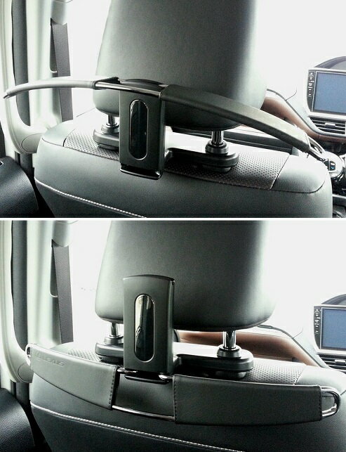 運転席や助手席ヘッドレストに装着してジャケットやネクタイなどを手軽に掛けておくことができる本革仕様のハンガー。